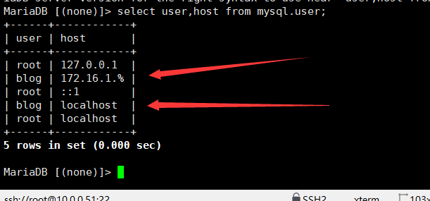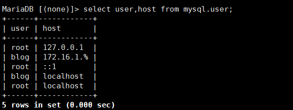 #'blog'@'172.16.1.%' 表明允许172.16.1.0的网段登录,数据库中需要用%表示全部