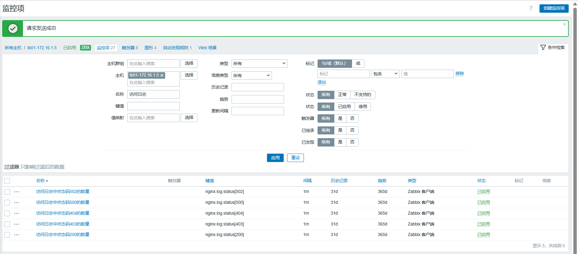 zabbix@7bb11638da53:~$ zabbix_get -s 172.16.1.5 -k check.ngx.error