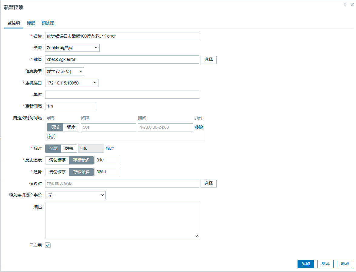 UserParameter=check.ngx.error,sudo tail -n1000 /var/log/nginx/error.log |egrep -i 'error|failed|denied'|wc -l