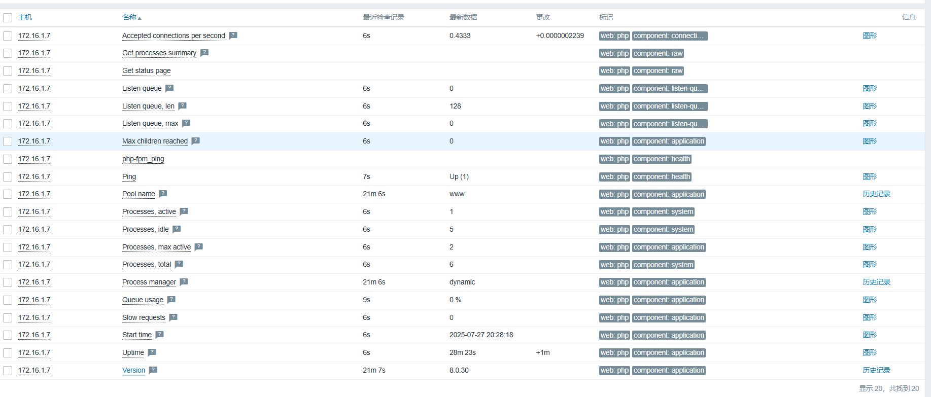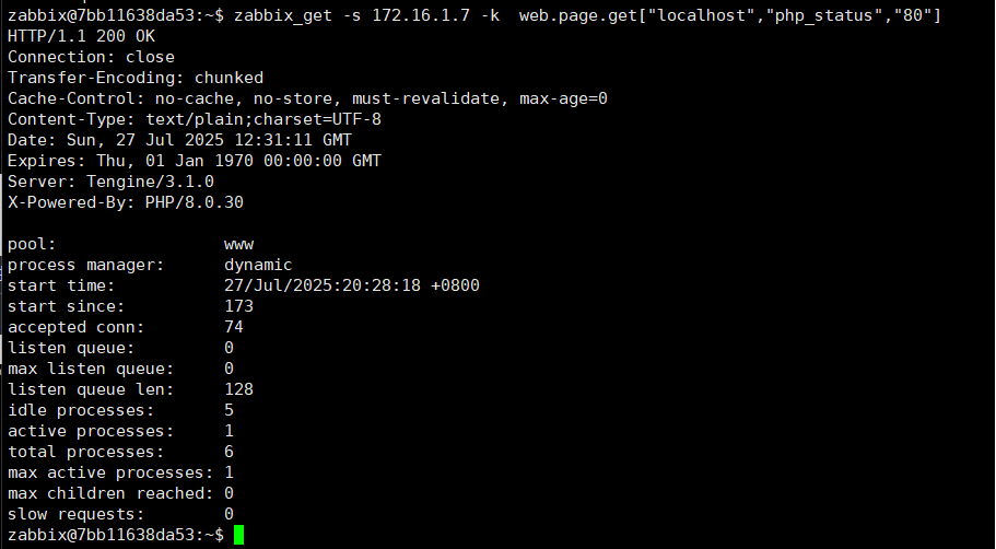 zabbix@7bb11638da53:~$ zabbix_get -s 172.16.1.7 -k web.page.get["localhost","php_status","80"]